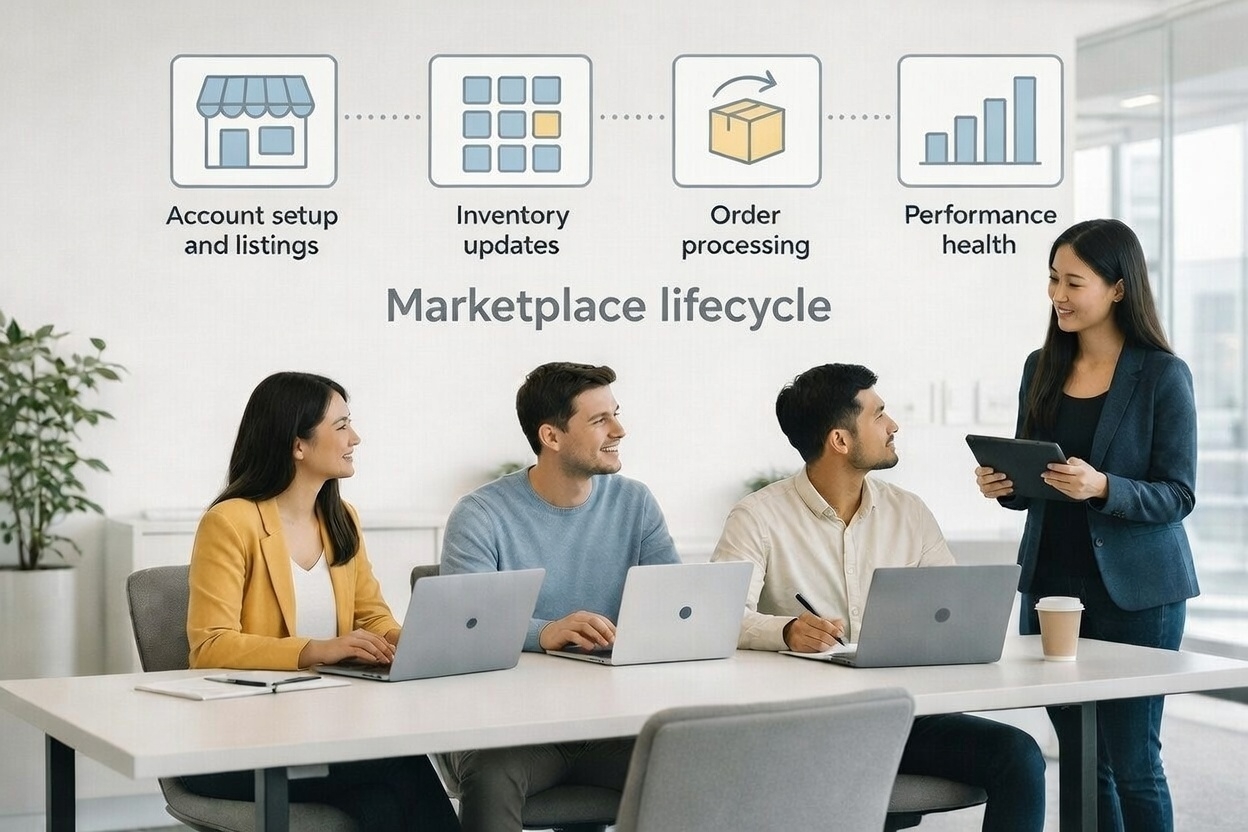 We manage the marketplace lifecycle end-to-end—from seller account setup and listings to inventory updates, order processing, returns, and performance health—so you can focus on products and long-term growth.